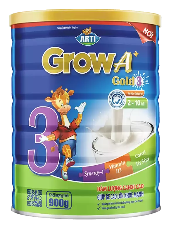 Arti Grow A+ Gold 3 với công thức cải tiến mới đặc biệt phù hợp theo từng lứa tuổi bổ sung Canxi có nguồn gốc từ sữa và hệ chất xơ hòa tan tự nhiên Prebiotic Orafti Synergy – 1(*) có tác dụng nâng cao hơn nữa hiệu quả của quá trình hấp thu Canxi. Qua đó, tăng mật độ xương giúp xương trở nên cứng cáp, giảm nguy cơ thấp còi, chậm lớn trẻ em và loãng xương ở người trưởng thành.