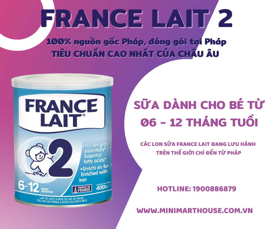 Sữa France Lait số 2 là công thức dinh dưỡng dành cho trẻ trong giai đoạn từ 6 - 12 tháng, cung cấp 13 vitamin và 13 khoáng chất thiết yếu cho sự phát triển toàn diện của bé. Hàm lượng các dưỡng chất có trong sữa, đặc biệt giàu Canxi, Omega 3, 6 hỗ trợ bé phát triển hệ xương chắc khỏe, trí não thông minh, hệ miễn dịch cũng như hệ tiêu hóa khỏe mạnh. Sữa được sản xuất và nhập khẩu 100% từ Cộng hòa Pháp, qua quy trình kiểm soát chất lượng gắt gao từ Châu Âu, mang đến cho bé dòng sữa an toàn để cùng bé phát triển.