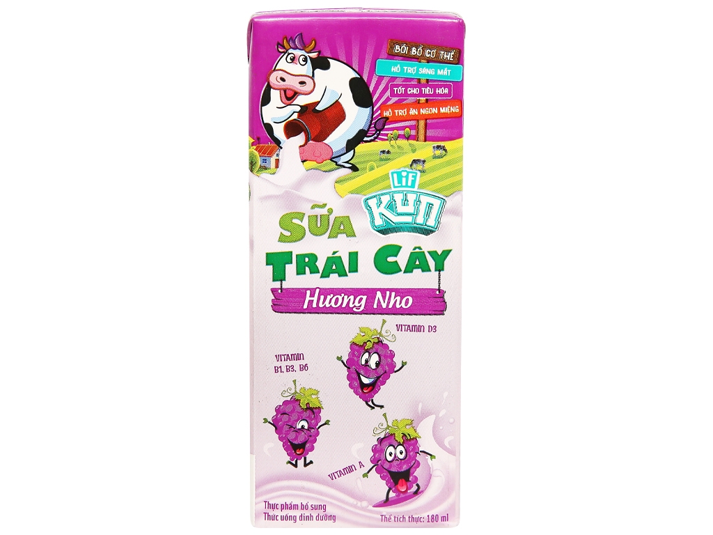 Thực phẩm bổ sung dinh dưỡng sữa chua uống trái cây LiF Kun bổ sung thêm nhiều vitamin nhóm B, A, D3 hỗ trợ tiêu hoá, sáng mắt và giúp cho bé ăn ngon hơn. Sữa trái cây LiF Kun hương nho 110ml hương nho thơm lừng, túi dễ bảo quản và dễ làm lạnh